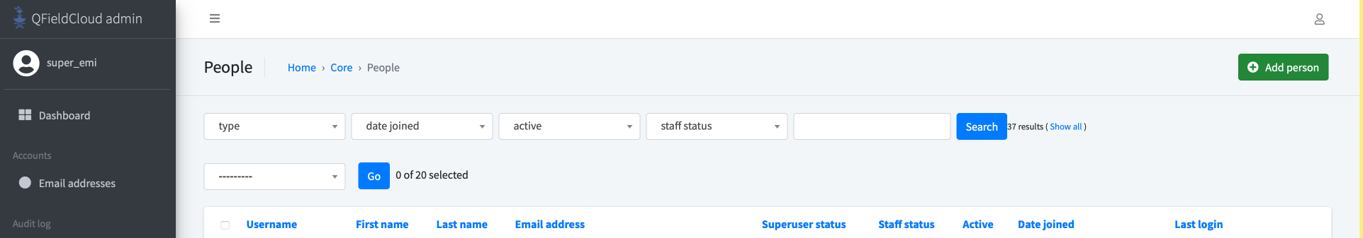 But for some reason users selection (e.g. for project members) does not work with the previous URL, so use the direct IP adress https://134.21.20.118:444/admin/login/?next=/admin/