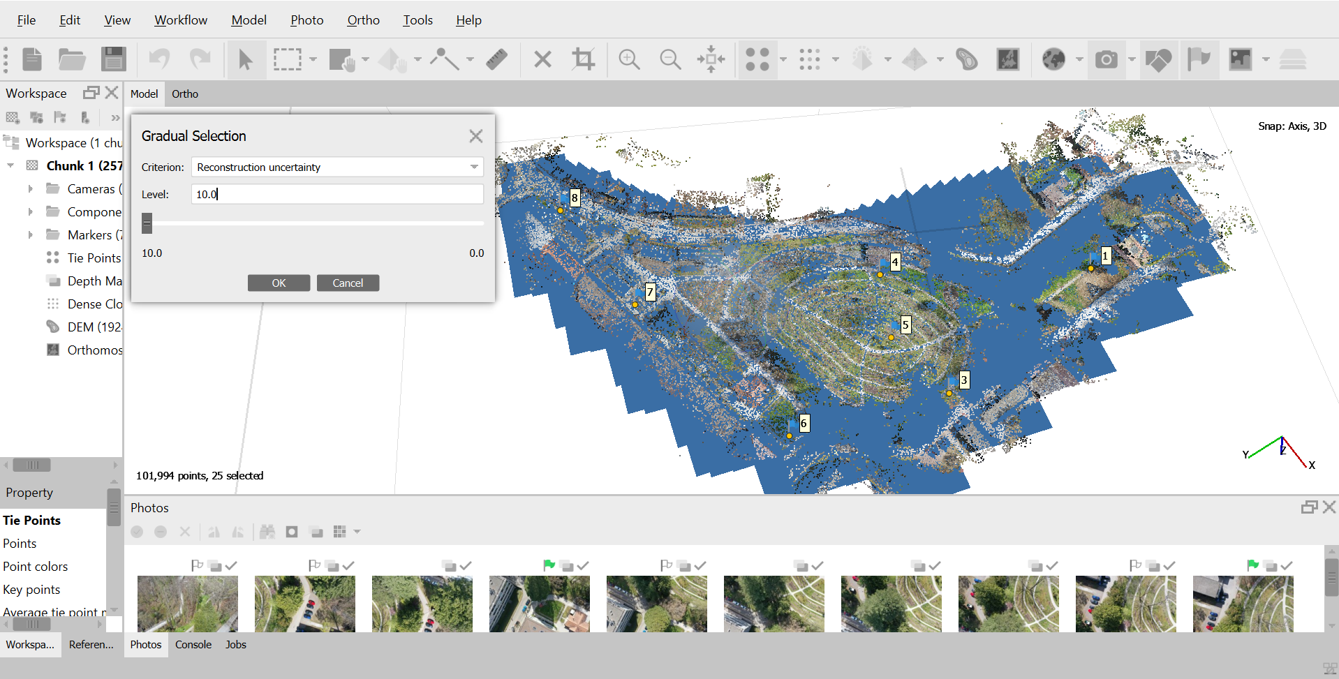 Some points in the points cloud could be wrong aligned. To obtain a high quality map, we have to remove them. Under Model/Gradual Selection we select Reconstruction Ucertainty and place the cursor at 10%. Then we ckick ok and delete (Figure 4). Then we repeat the operation with Project Accuracy. Then we have to update the camera positions in Tools/Optimize Cameras by ckicking ok.